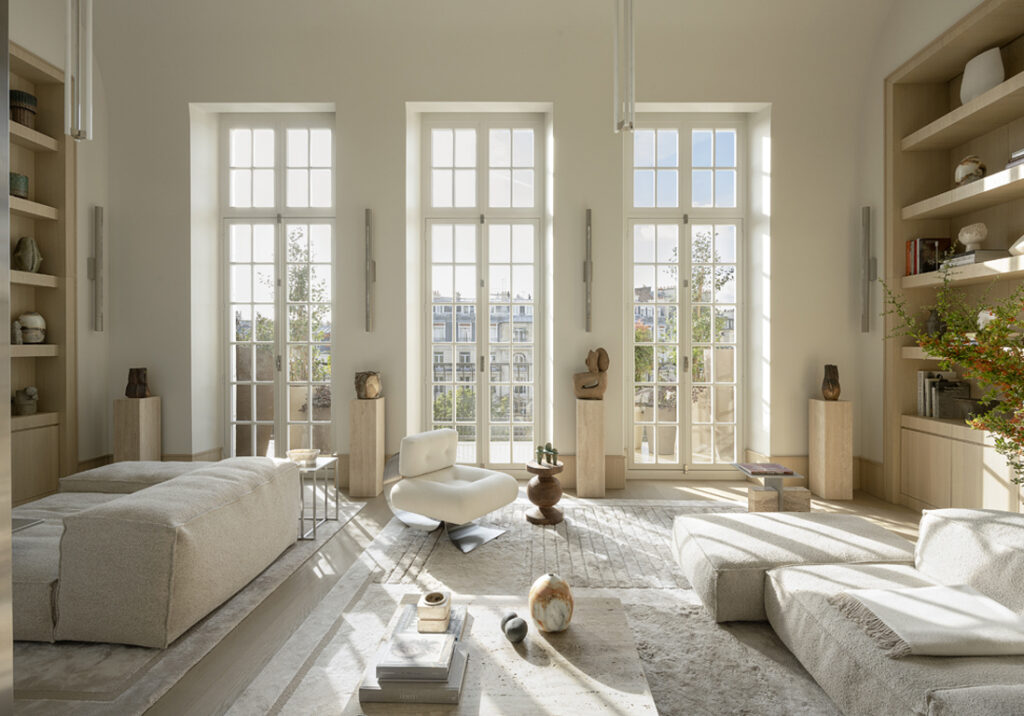 Le blanc est la teinte qui réagit le plus à la lumière. Une ambiance monochrome blanc cassé peut changer radicalement selon l’heure de la journée et l’éclairage artificiel choisi.